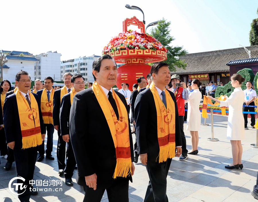 馬英九同宋濤進入伏羲廟,拜謁祖廟,敬獻花籃,寄托追思與尊崇之情。(中國臺灣網(wǎng)記者 尹賽楠 攝)