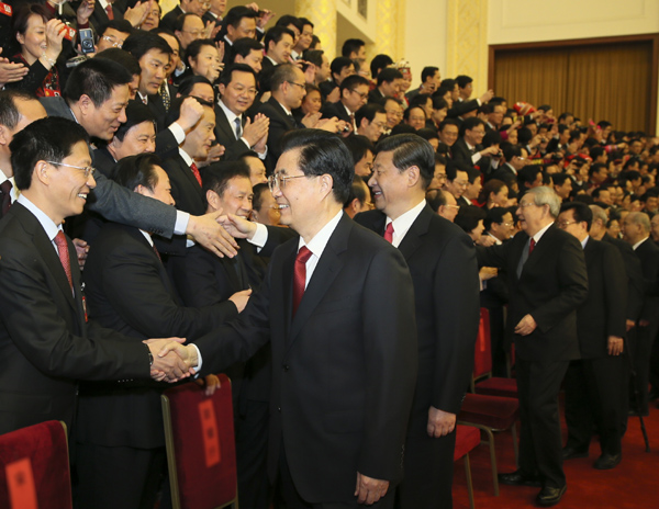 下午3時,胡錦濤、習近平步入宴會廳,全場響起雷鳴般的掌聲。胡錦濤、習近平等領導同志走到代表面前,同前幾排同志親切握手,向大家致以良好的祝愿。代表們紛紛向胡錦濤、習近平等領導同志表達真誠的問候。