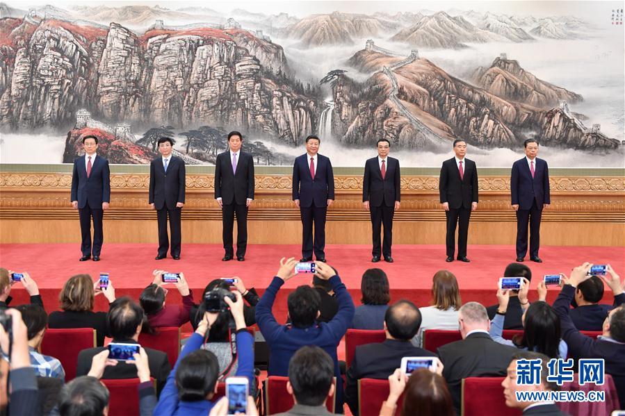 10月25日,剛剛在中共十九屆一中全會上當(dāng)選的中共中央總書記習(xí)近平和中央政治局常委李克強、栗戰(zhàn)書、汪洋、王滬寧、趙樂際、韓正在北京人民大會堂同采訪十九大的中外記者見面。新華社記者 李濤 攝