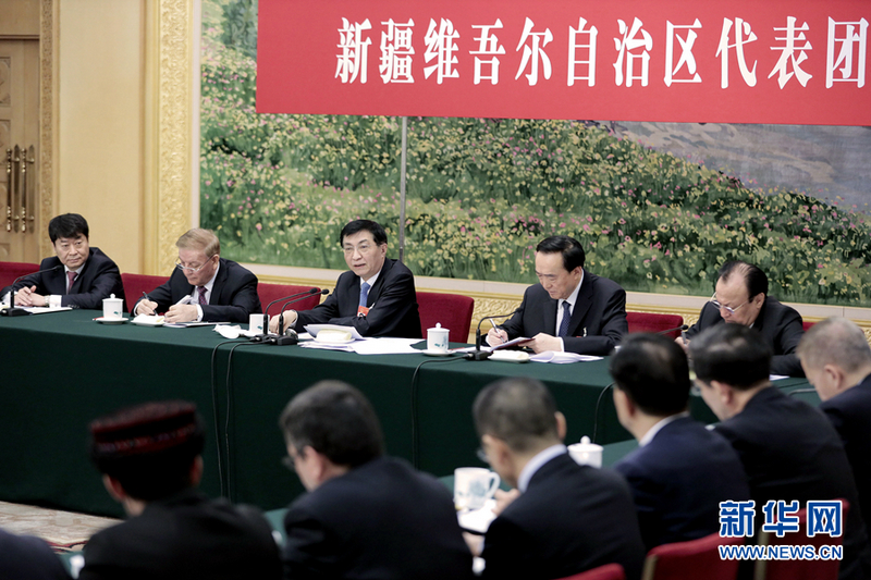 3月10日,中共中央政治局常委、中央書(shū)記處書(shū)記王滬寧參加十三屆全國(guó)人大二次會(huì)議新疆代表團(tuán)的審議。 新華社記者 劉彬 攝